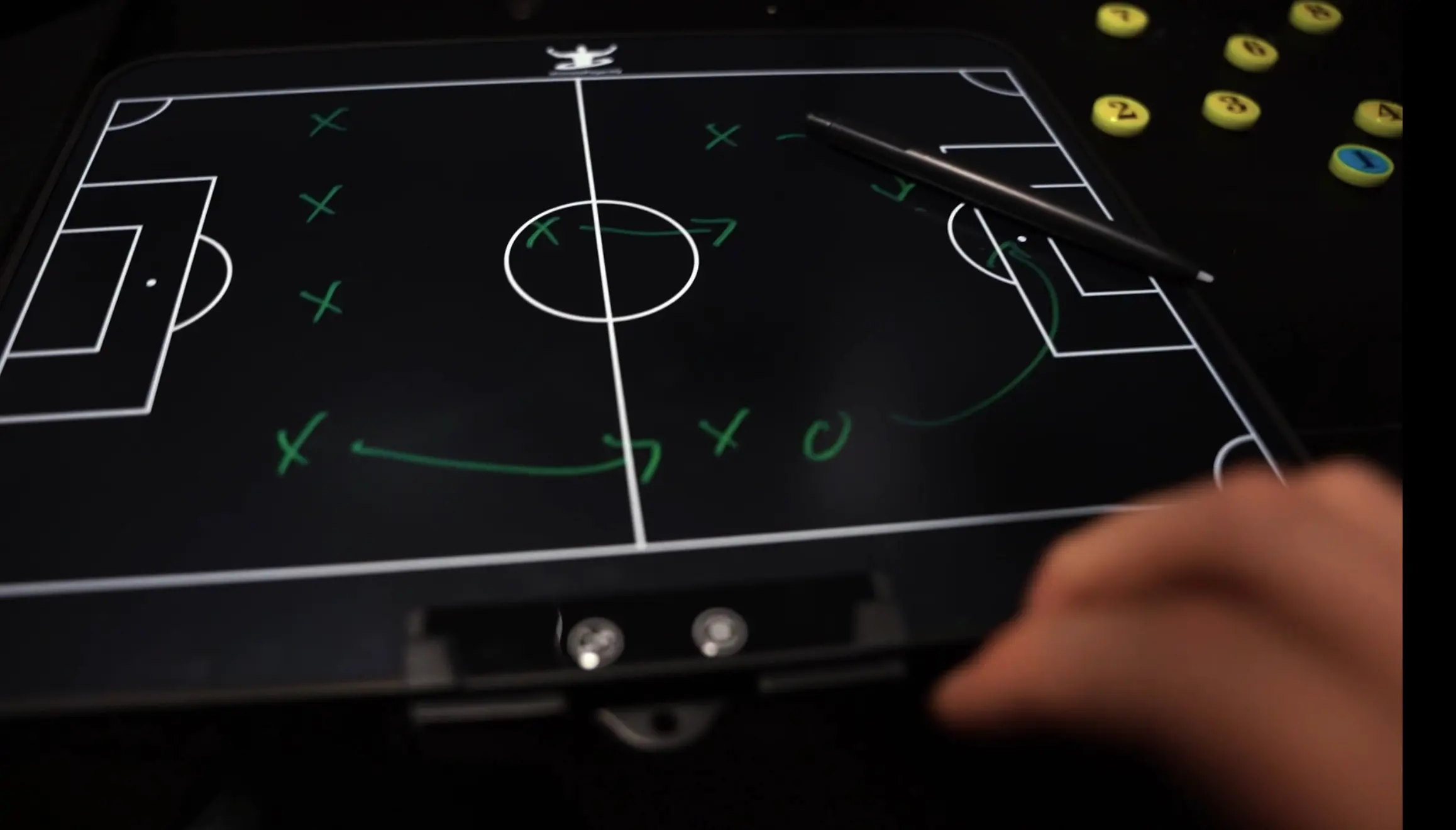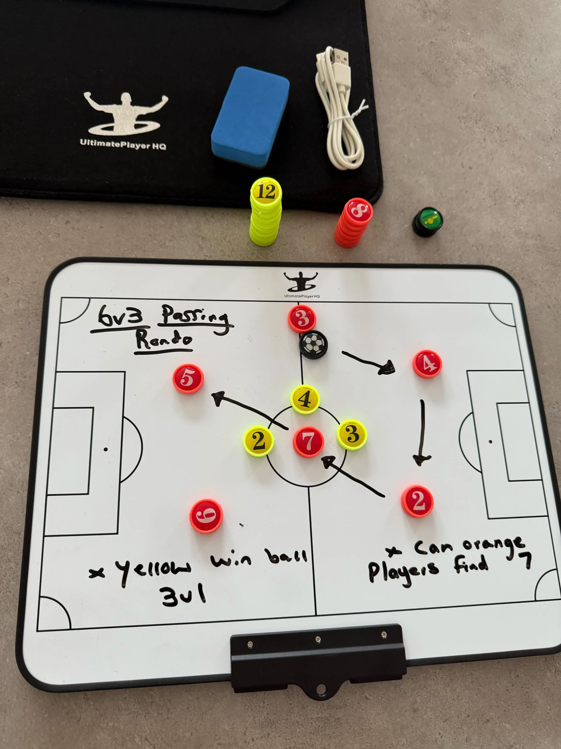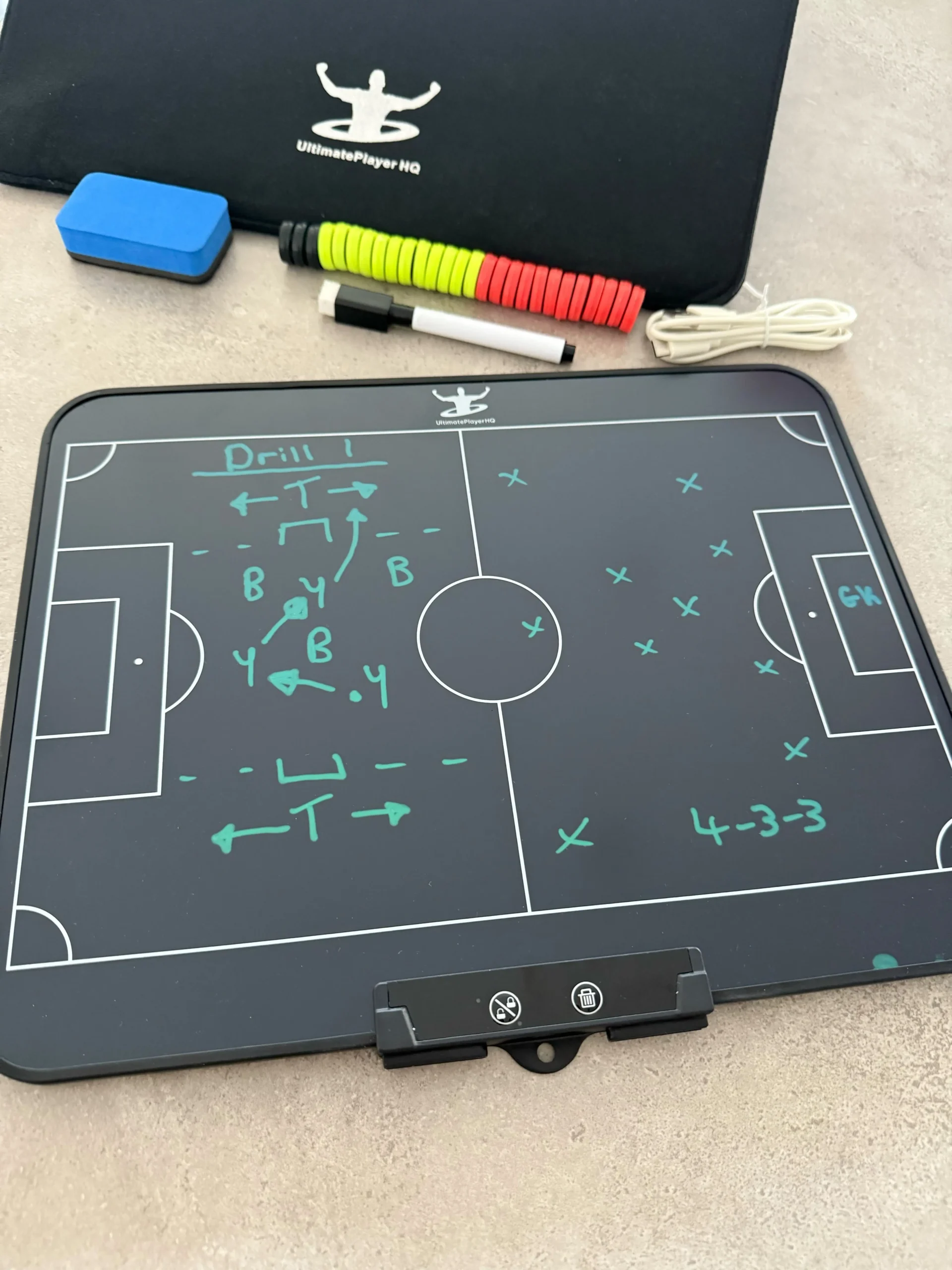 The ultimate coaching tool for football professionals. This 16โณ board combines an electric tactical display with a classic whiteboard surface. Lightweight, portable, and magnetic for easy formation setup. Includes electric pen, marker, folder, eraser, and 27 magnets. Perfect for clear, dynamic tactical planning and player engagement.